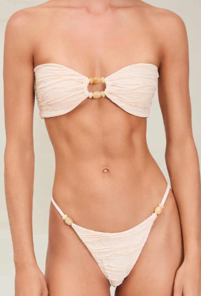The Anto is a strapless, bandeau with removable padding and beaded detail at center front cut out. Pairs back with the Alina Bottom.